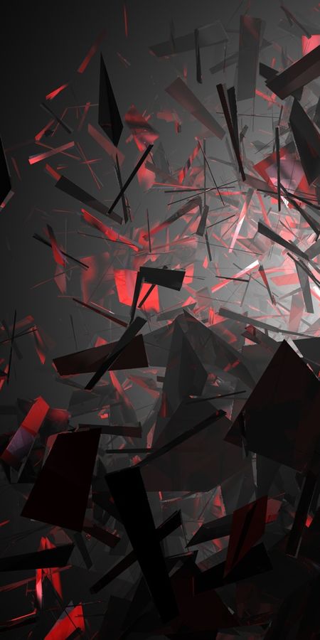 A striking digital abstract artwork featuring a dynamic array of angular black and red shapes.