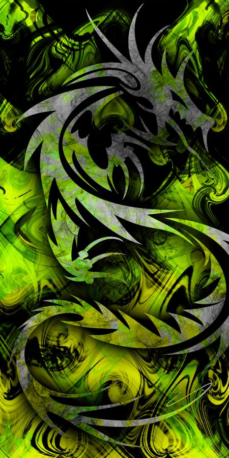 The dragon twists dynamically through a vibrant neon green and black abstract background, with marbling and splatter textures enhancing movement and energy.