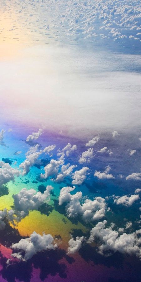 A stunning high-resolution photograph capturing fluffy clouds under soft sunrise hues with a vivid rainbow arc reflecting across the sky, evoking wonder and serene beauty.