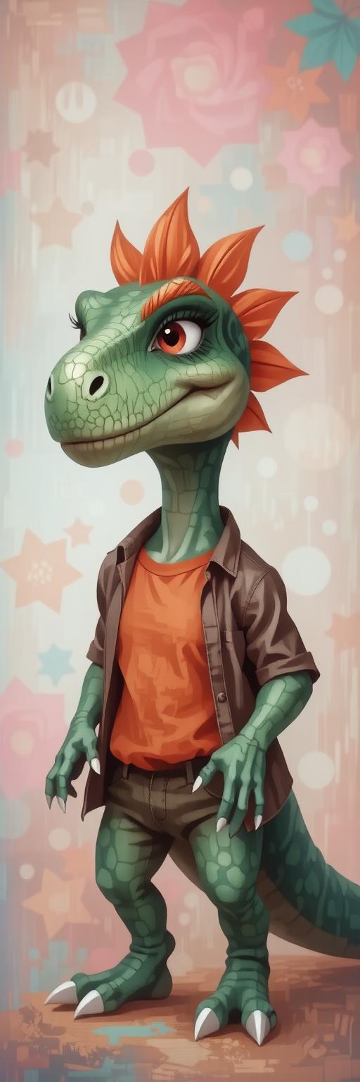 A playful digital artwork of a bright green and blue dinosaur with orange spikes, wearing a casual outfit against a backdrop of vibrant pink, orange, and blue geometric shapes.
