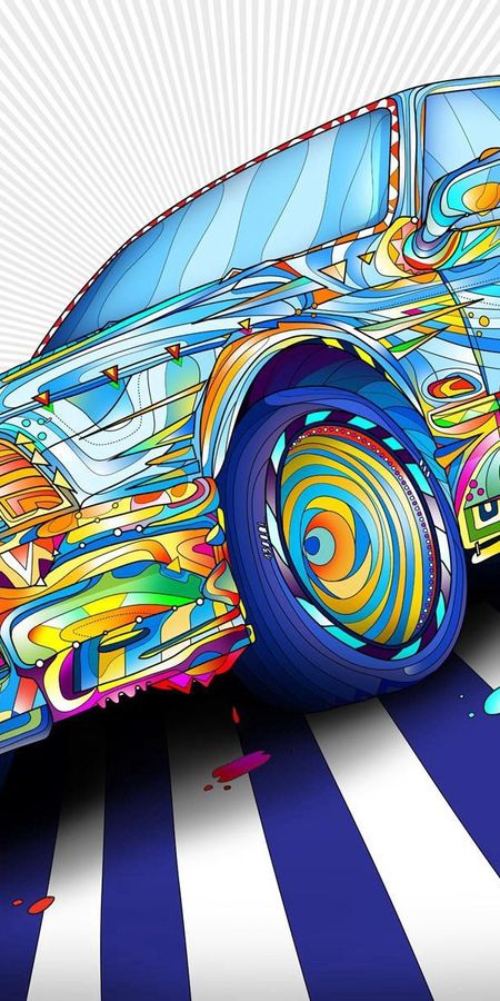A vibrant digital artwork of a stylized car with swirling, colorful patterns in blue, yellow, green, and pink. White radial lines and striped ground enhance motion, creating a modern psychedelic