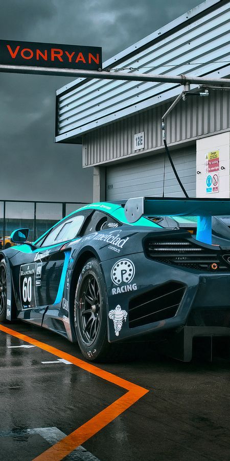 A sleek blue and black race car sits in the pit area beneath a gray, overcast sky.