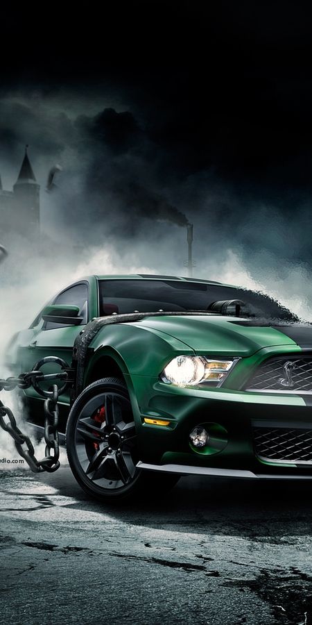 A high-resolution, dramatic wallpaper featuring a sleek green sports car chained to the ground under a dark, foggy sky.
