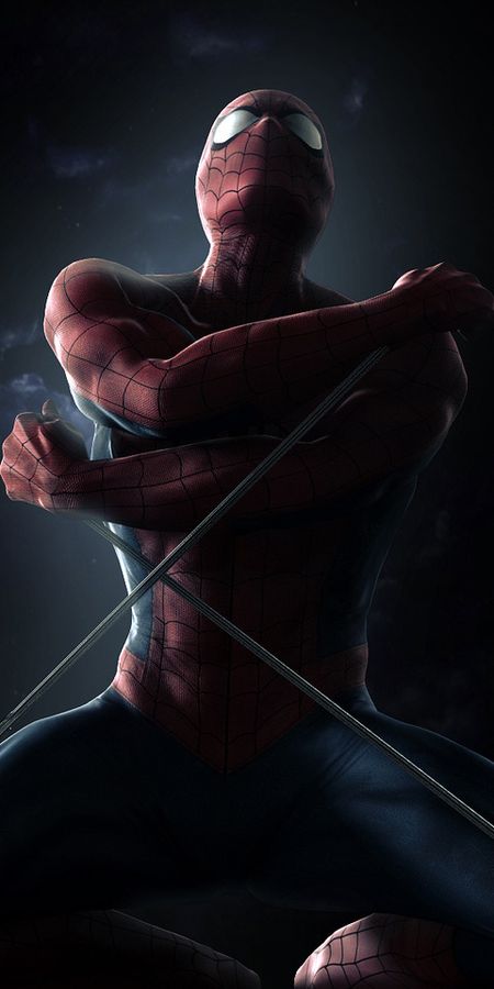 A cinematic digital illustration of Spider-Man in red-and-blue suit, suspended mid-air with crossed arms, highlighted by dramatic lighting and moody, glowing clouds.