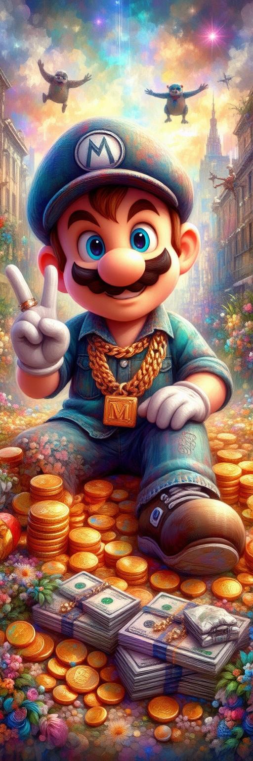 A cartoon-style Super Mario parody sitting on piles of gold coins and cash, wearing flashy jewelry, a black cap, and sneakers, posing confidently with urban buildings in the background.