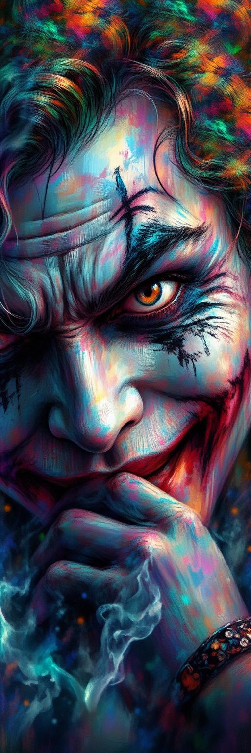 A hyper-detailed close-up of the Joker with smeared makeup, piercing eyes, and swirling cigarette smoke, set against dramatic shadows in stunning 4K realism.