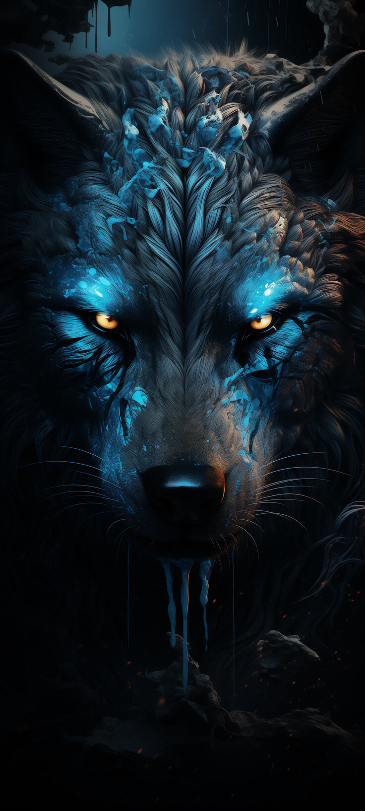 A dramatic digital artwork of a blue-tinged wolf with glowing yellow eyes, wet detailed fur, and a dark forest backdrop, exuding eerie nocturnal intensity.