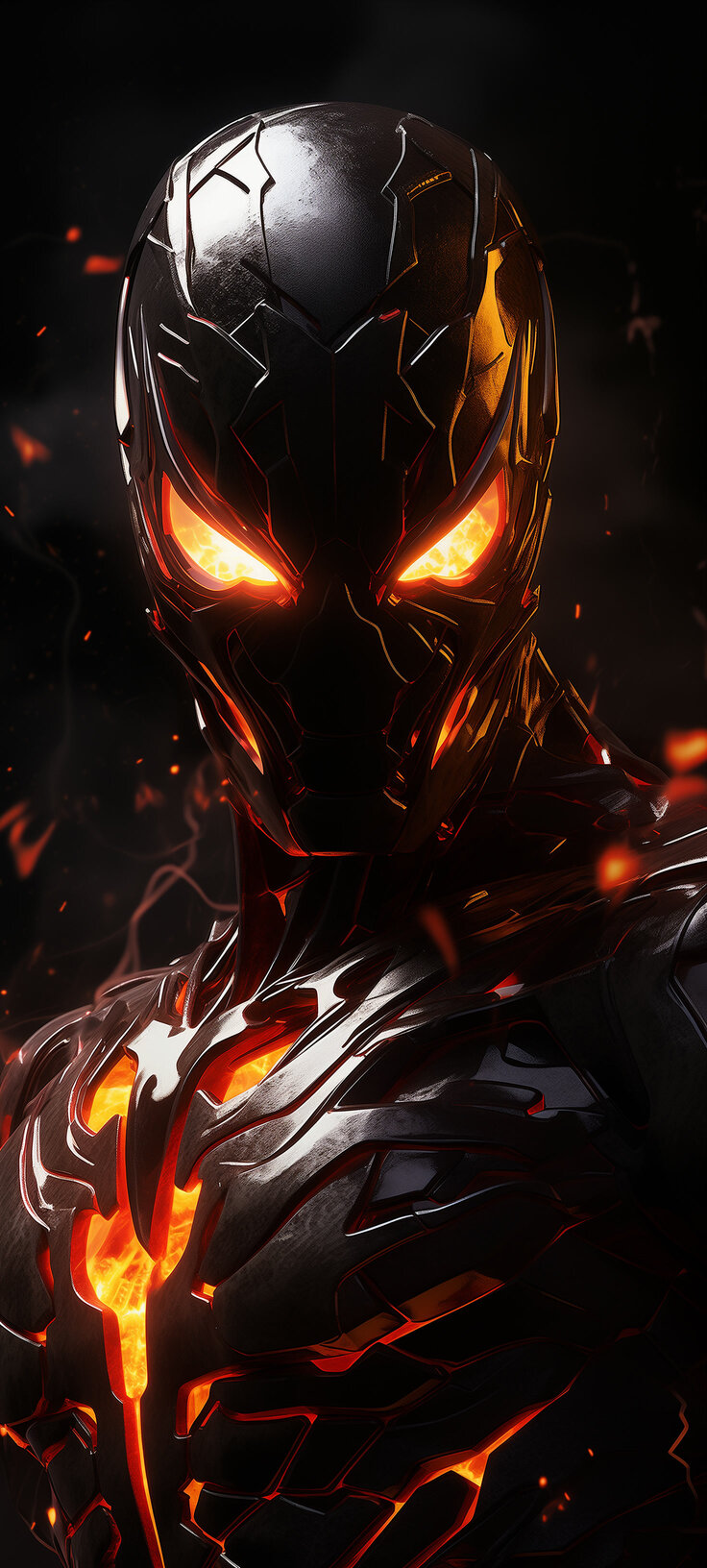 A striking digital CGI illustration of a masked superhero clad in a sleek, armored black suit. The glossy armor is accented with glowing, orange-yellow cracks resembling molten lava, creating a
