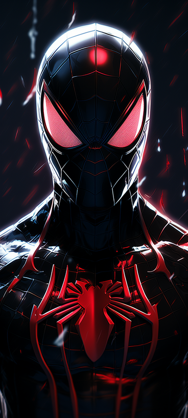 A highly detailed digital CGI wallpaper featuring Spider-Man in a dark, moody aesthetic. The close-up highlights his head and upper torso, clad in the iconic black and red suit with