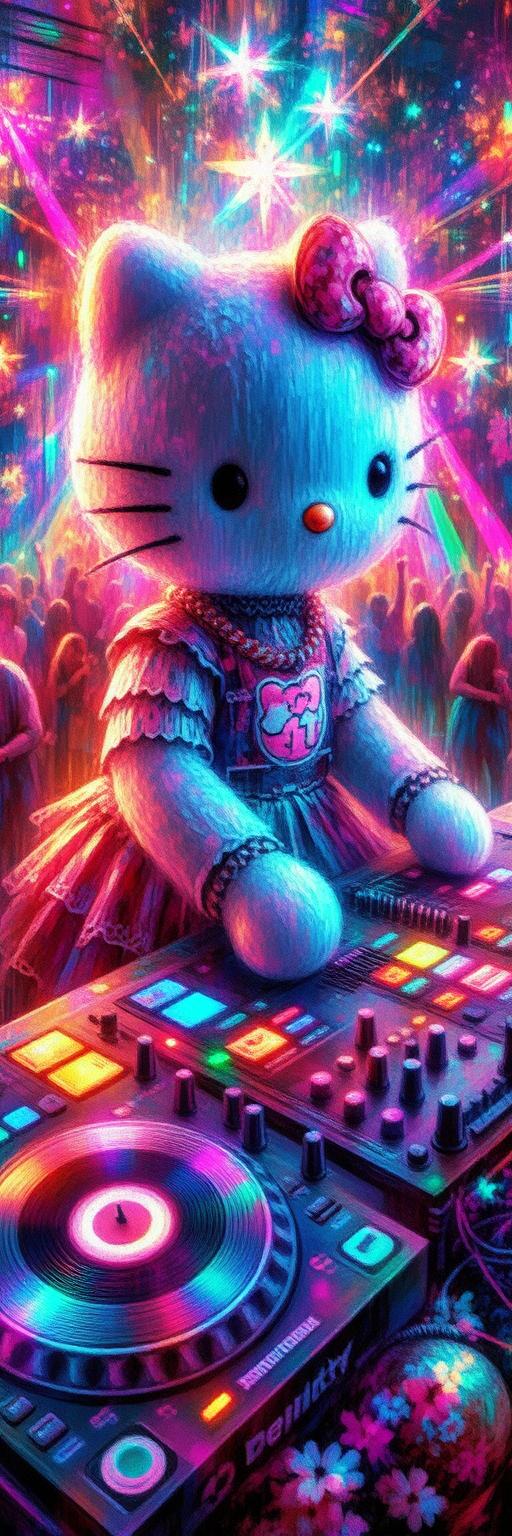 Hello Kitty spins glowing turntables at a neon rave, surrounded by lasers, dancing crowds, and cyberpunk festival energy in a vibrant, dynamic party wallpaper.
