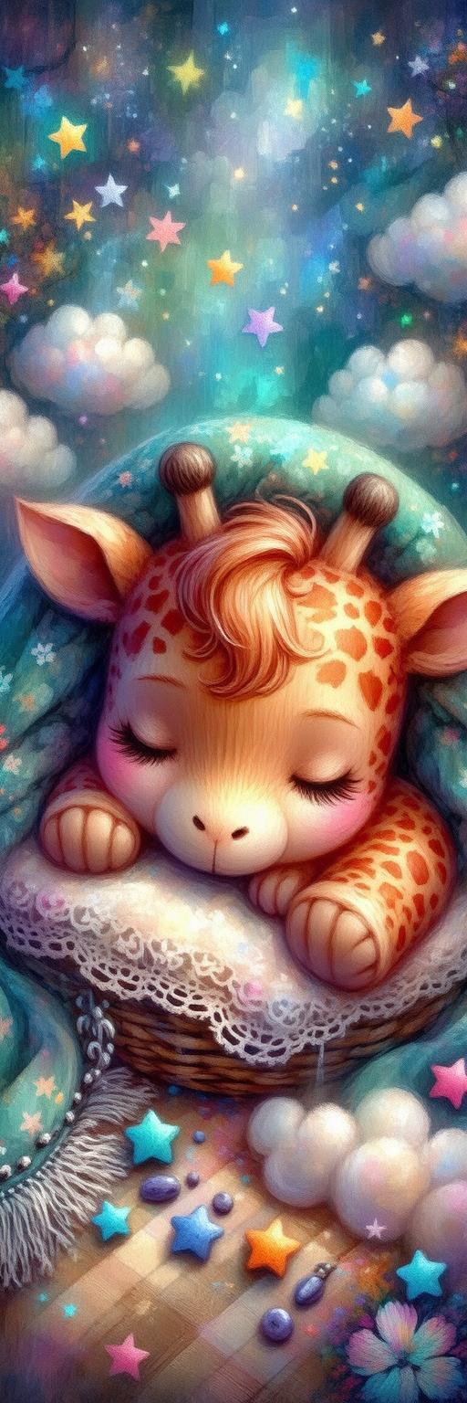 A cute cartoon giraffe peacefully sleeps on a fluffy pillow under a teal blanket with stars and clouds, set against a dreamy starry night.