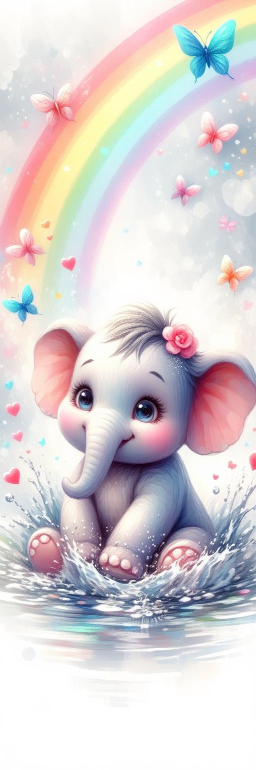 A cheerful cartoon elephant with big, expressive eyes and pink accents on its ears and feet joyfully splashes in water beneath a vibrant rainbow.