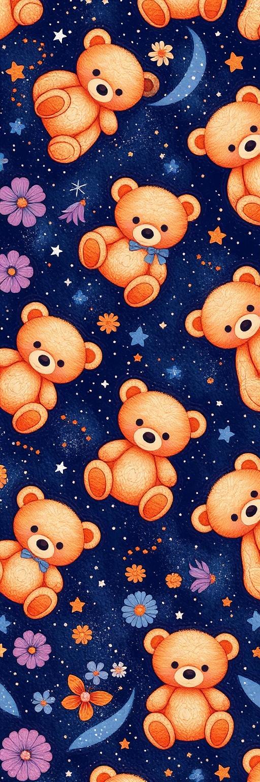 A vibrant pattern of cute teddy bears in playful poses, surrounded by colorful flowers and bows, set against a deep navy starry background.