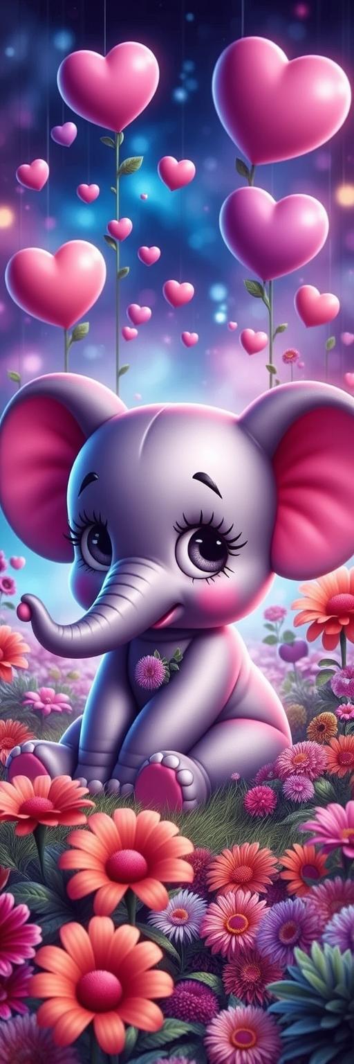 A charming cartoon elephant with expressive eyes and pink-accented ears sits among vibrant flowers, surrounded by whimsical hearts, creating a cheerful, colorful, and affectionate scene.