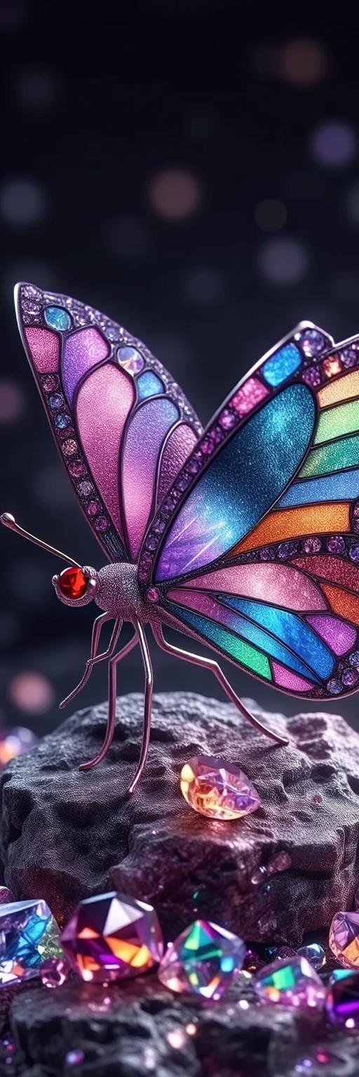 A stunning butterfly with iridescent stained-glass wings in shades of purple, pink, and blue perches on a dark, textured rock.