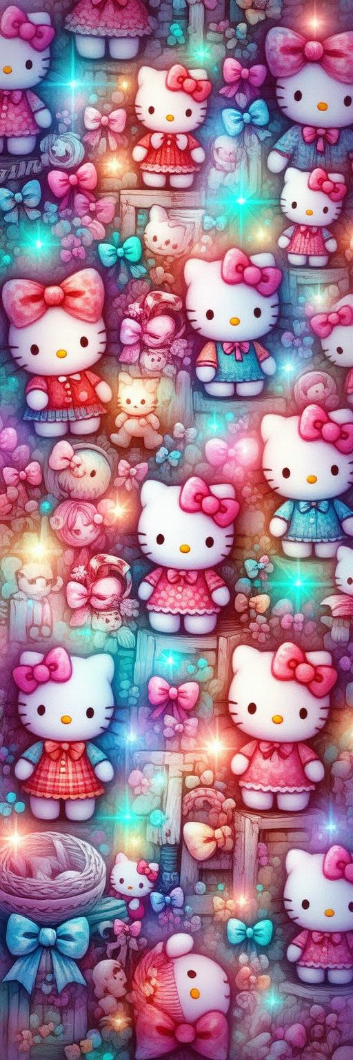 A vibrant Hello Kitty pattern featuring colorful outfits and bows, set against glowing teal and pink lights, creating a playful, whimsical, and cheerful atmosphere.