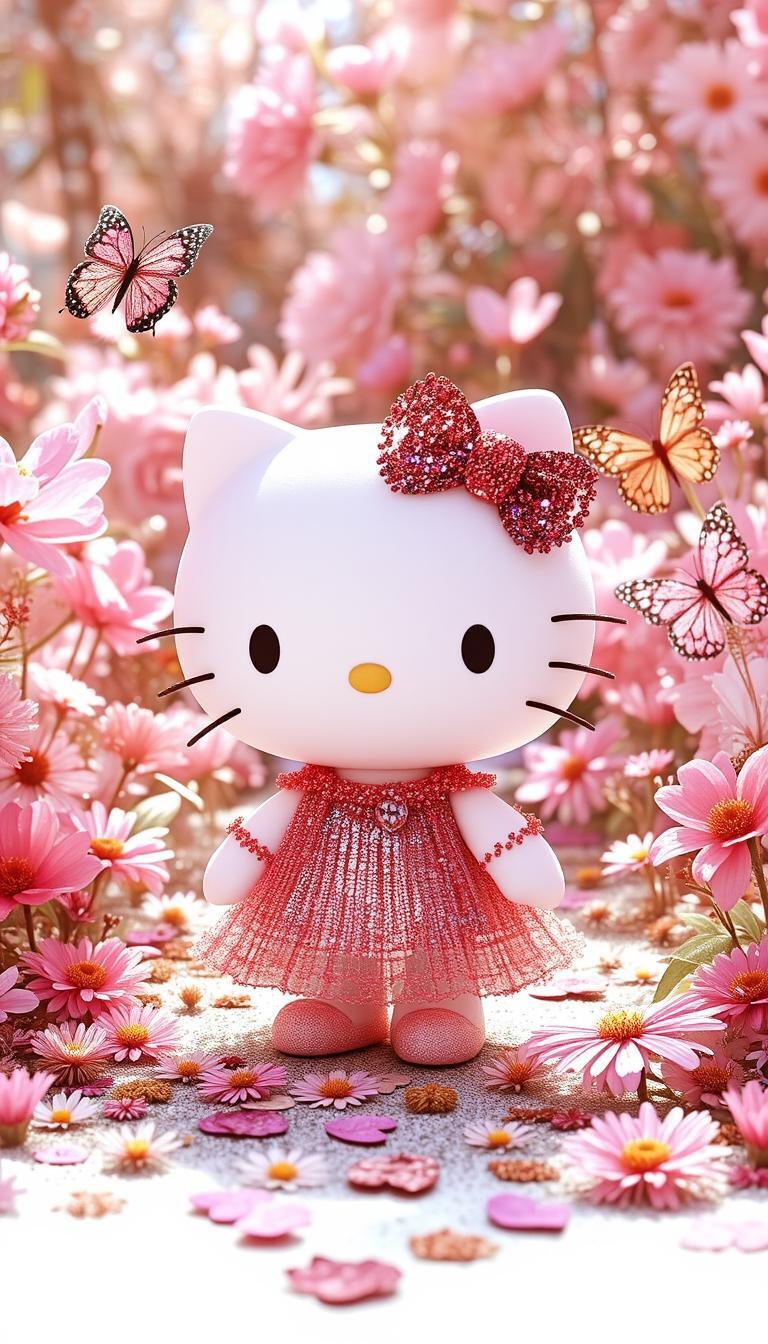 Hello Kitty stands gracefully in a serene garden, surrounded by pink, gold, and lavender butterflies, blooming flowers, and glowing sunlight that fills the scene with warmth.