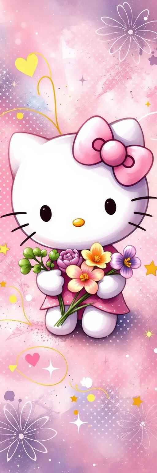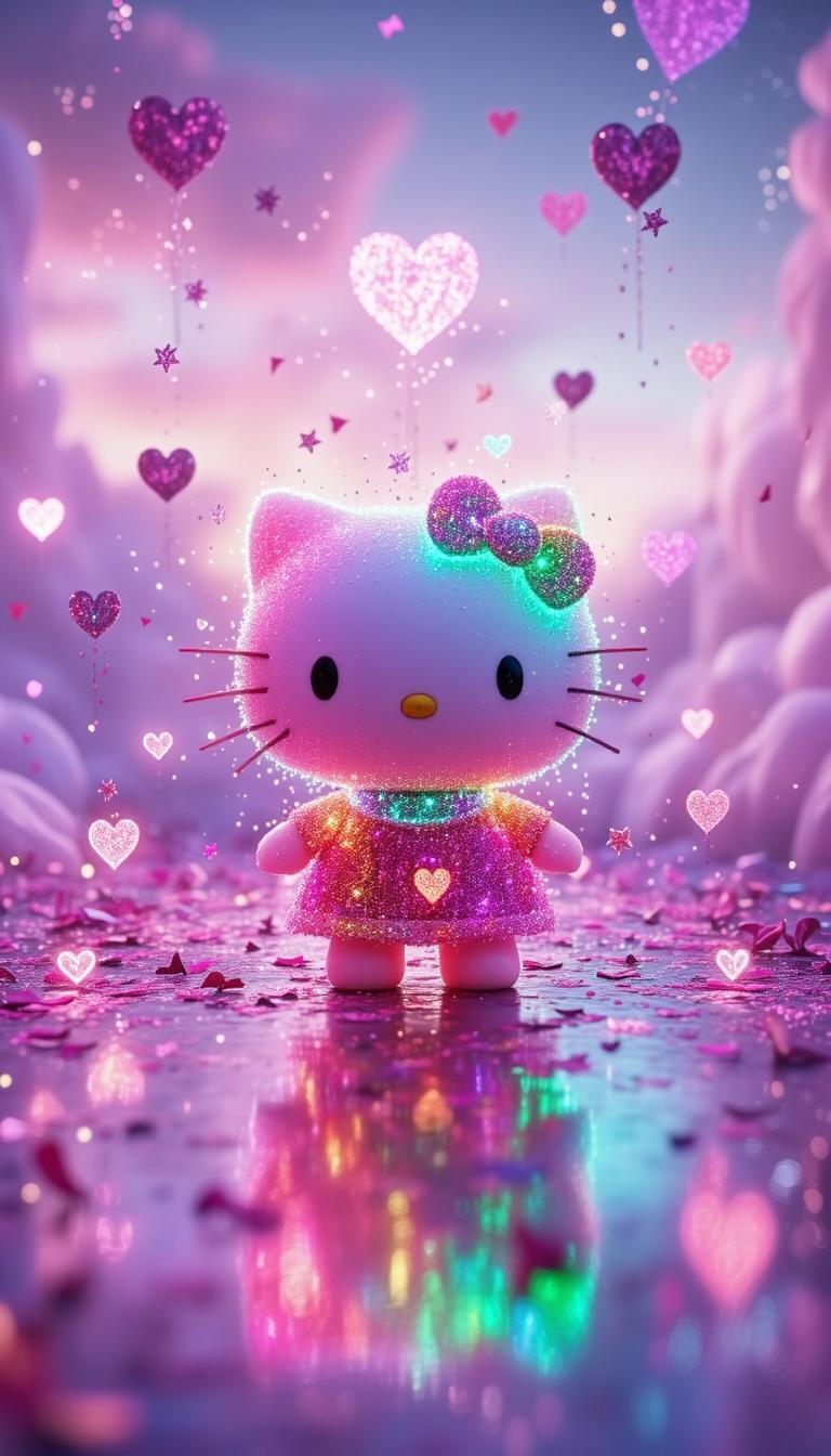A joyful Hello Kitty scene surrounded by glowing rainbow hearts, shimmering stars, and sparkling confetti against a dreamy pastel sky full of uplifting energy.