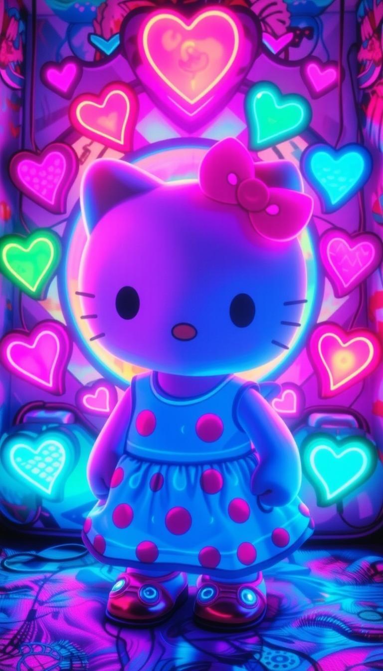 Whimsical Hello Kitty wallpaper featuring her in a blue polka-dot dress, pink bow, surrounded by glowing hearts on a soft pastel background, radiating cheerful charm.