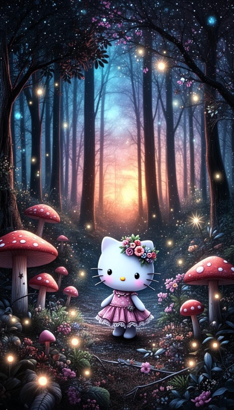 Hello Kitty dons a floral crown and frilly dress, surrounded by glowing mushrooms and fireflies under a pastel sunset, creating a whimsical, fairytale forest scene.