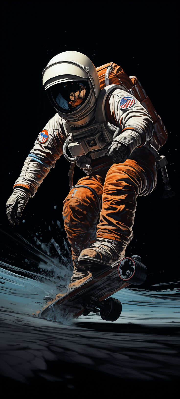 A hyper-realistic digital illustration of an astronaut performing a skateboard trick, clad in detailed gear with orange pants, dynamic water splashes, and a striking black background.