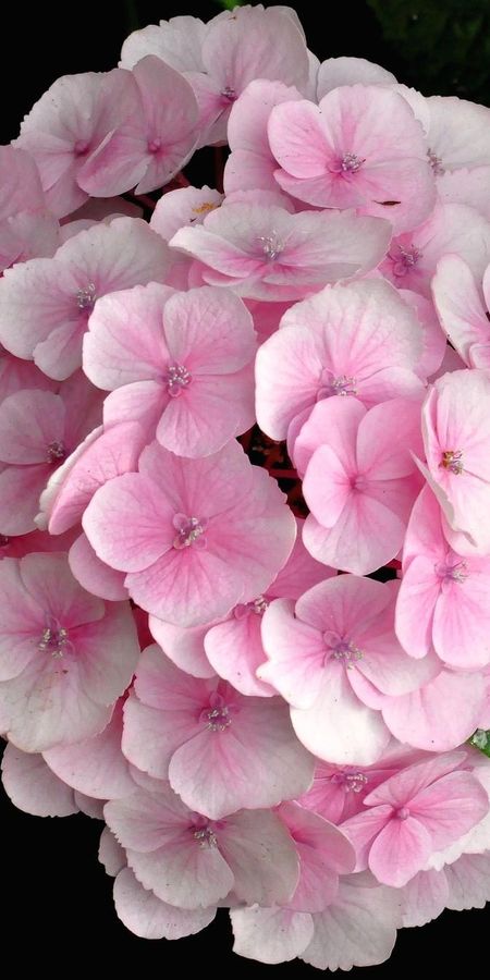 Pink Hydrangea Bloom Wallpaper is a delicate phone background featuring a close-up view of soft pink hydrangea flowers surrounded by gentle green leaves.