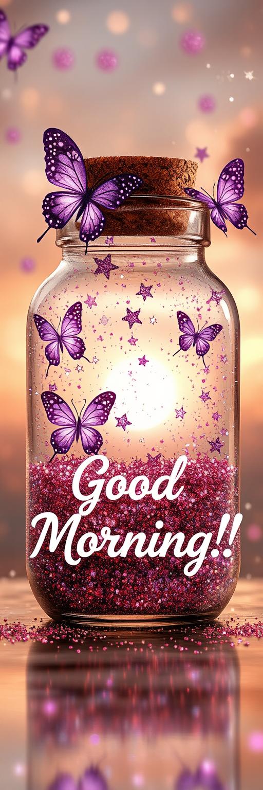 A dreamy glass jar filled with sparkling pink glitter, sealed with a cork, sits surrounded by floating purple butterflies.