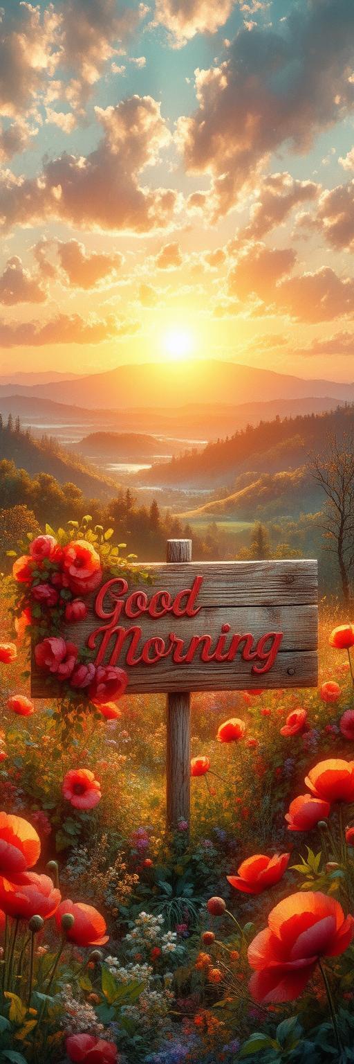 A cheerful wooden sign with “Good Morning” in cursive is surrounded by bright red poppies and lush greenery.