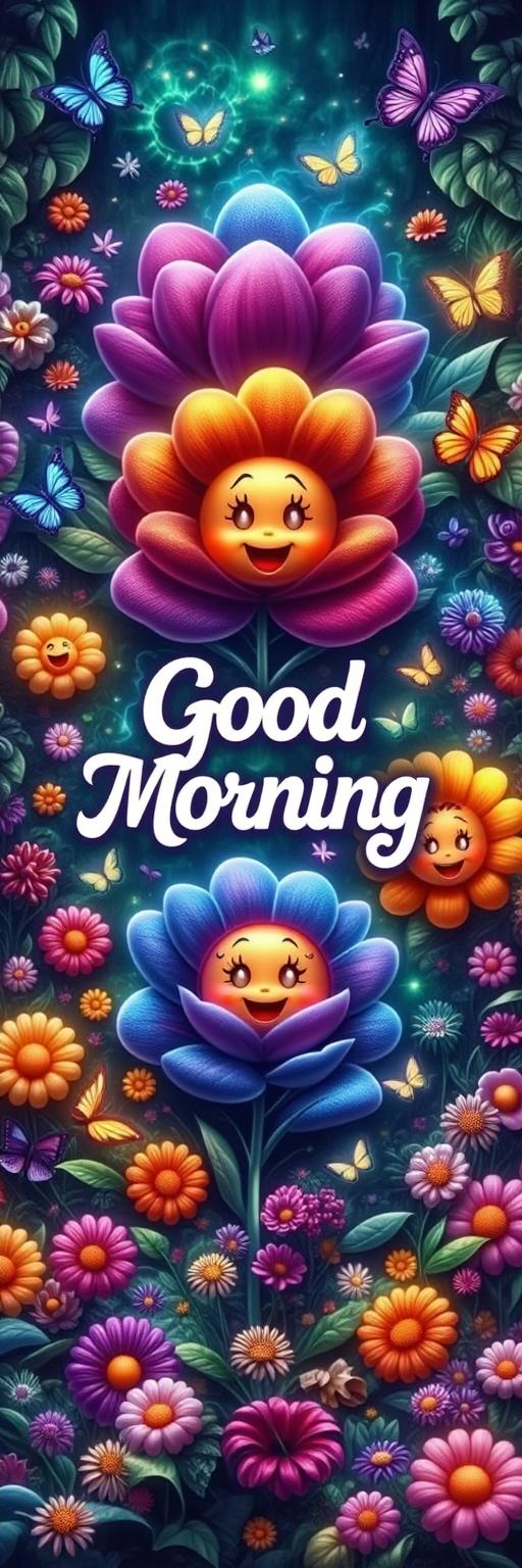 A vibrant digital illustration of colorful flowers with happy, smiling faces surrounded by cheerful butterflies and fluffy blossoms.