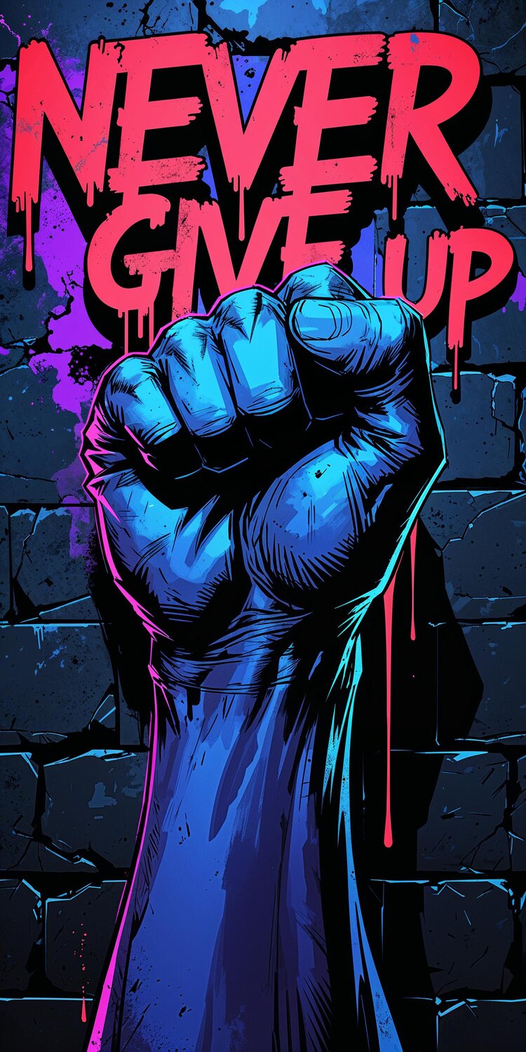 A powerful digital wallpaper in comic book style, depicting a clenched bluish fist raised against a dark brick wall.