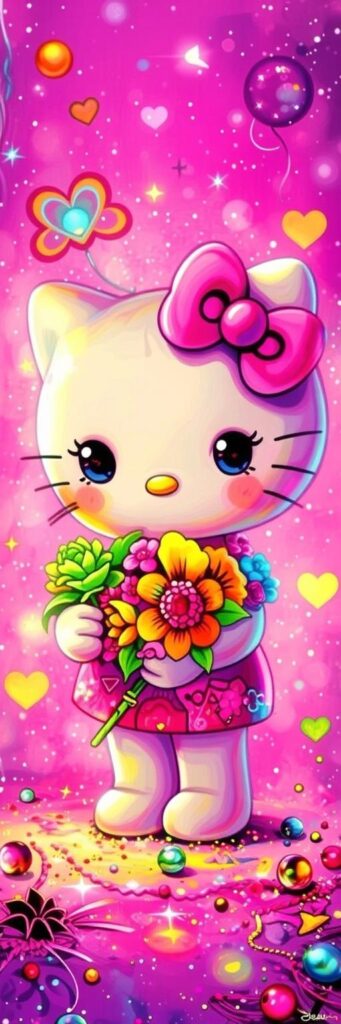 A playful, stylized cat wearing a bright pink dress decorated with colorful heart-shaped patches stands on a sparkling pink surface.