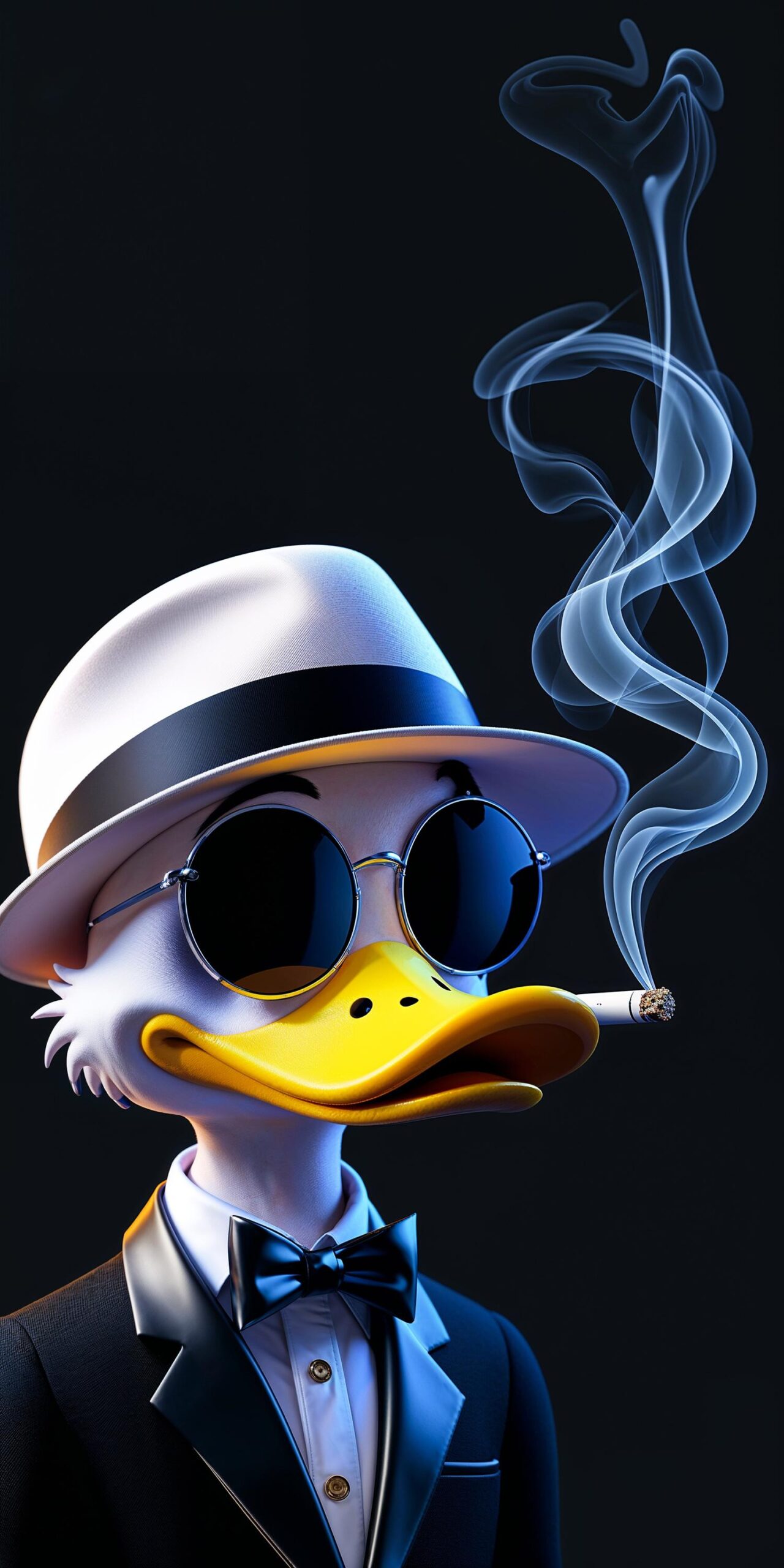 Noir Duck Gentleman Wallpaper features a CGI-rendered anthropomorphic duck dressed in a sleek black tuxedo, bow tie, and white fedora with a black band.