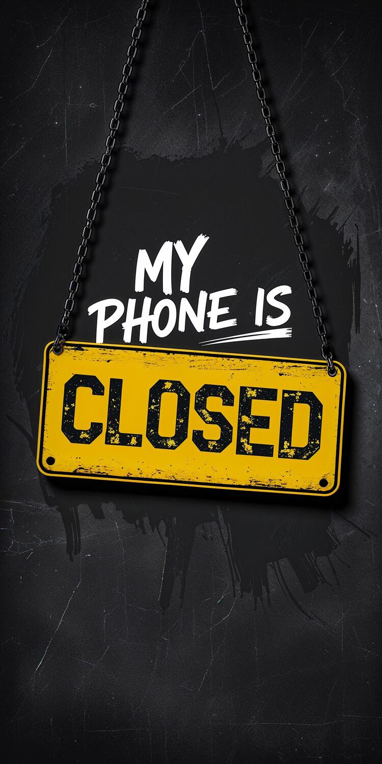 My Phone Is Closed Wallpaper is a bold digital graphic featuring a rustic yellow “CLOSED” sign with distressed black lettering hanging from a chain.