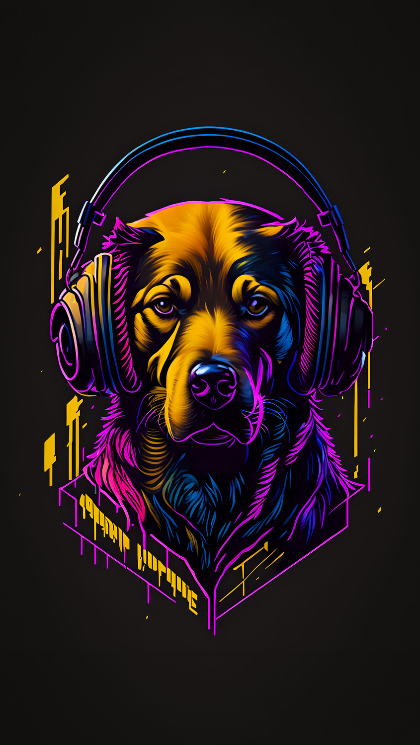 Neon Cyberpunk Puppy Wallpaper is a vibrant digital illustration featuring a dog’s head glowing in vivid neon shades of purple, yellow, and orange.