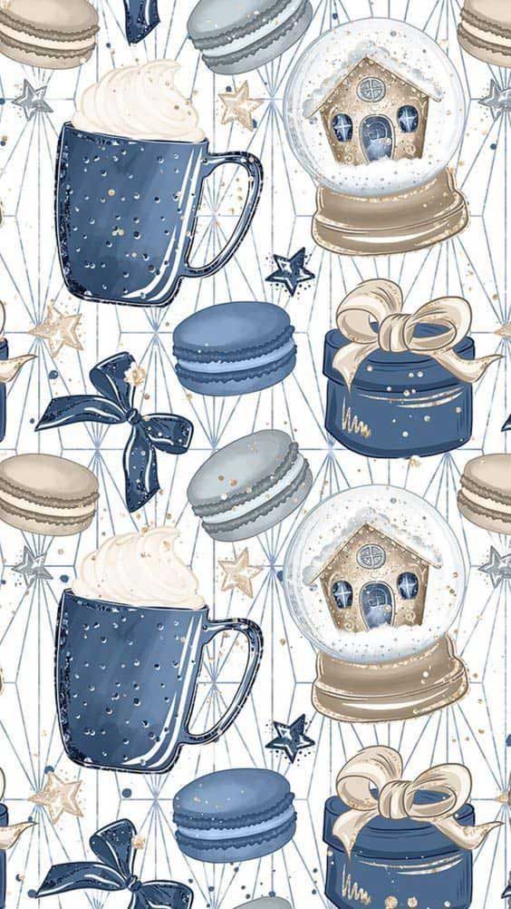 A whimsical festive wallpaper featuring blue mugs with snowflakes, colorful macarons, charming gift boxes with bows and stars, and enchanting snow globes with tiny houses.