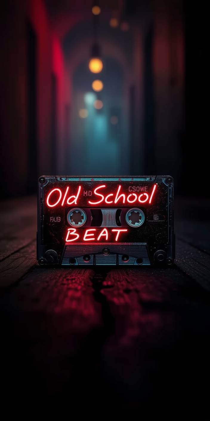 Vintage cassette tape on scratched wooden floor with neon text, dim corridor lighting, nostalgic music.