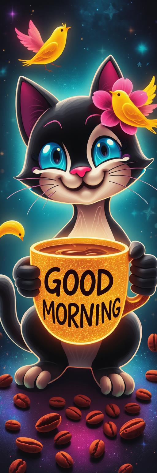 This playful digital wallpaper features a whimsical black-and-white cat with large blue eyes and a pink flower tucked behind its ear, joyfully holding a sparkling golden cup of coffee.