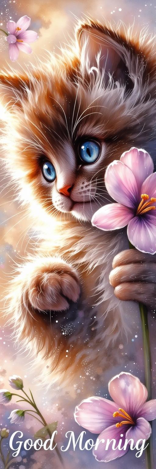 This adorable digital wallpaper features a fluffy kitten with large, expressive eyes, holding a bright pink flower in its paw.