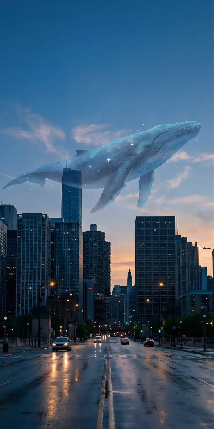Surreal translucent whale flying above wet city street at dusk, glowing patterns, dreamy fantasy atmosphere.