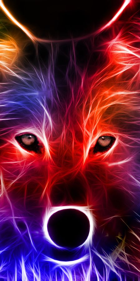 A striking CGI digital artwork of a wolf’s face illuminated with vibrant neon fur in red, orange, and blue. Its glowing white eyes radiate intensity, contrasted against a dark, futuristic