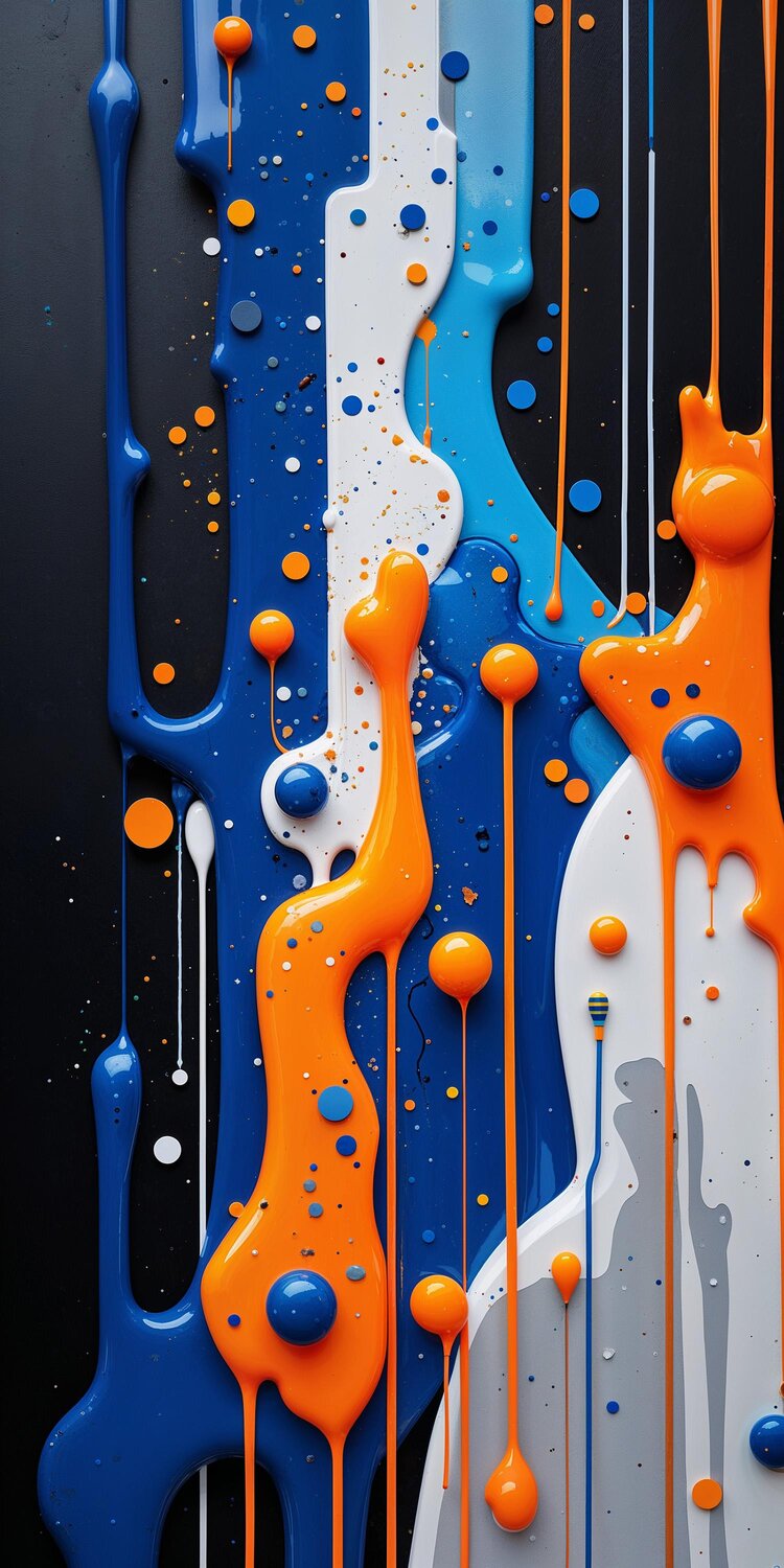 A vibrant digital artwork of fluid, liquid-like shapes in bold blue, white, and orange flows dynamically against a black background.