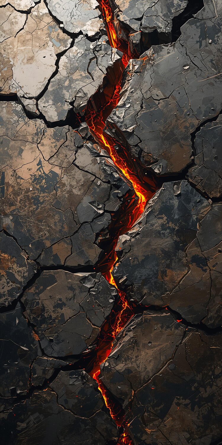 A CGI digital artwork of a fractured rock surface filled with glowing lava.