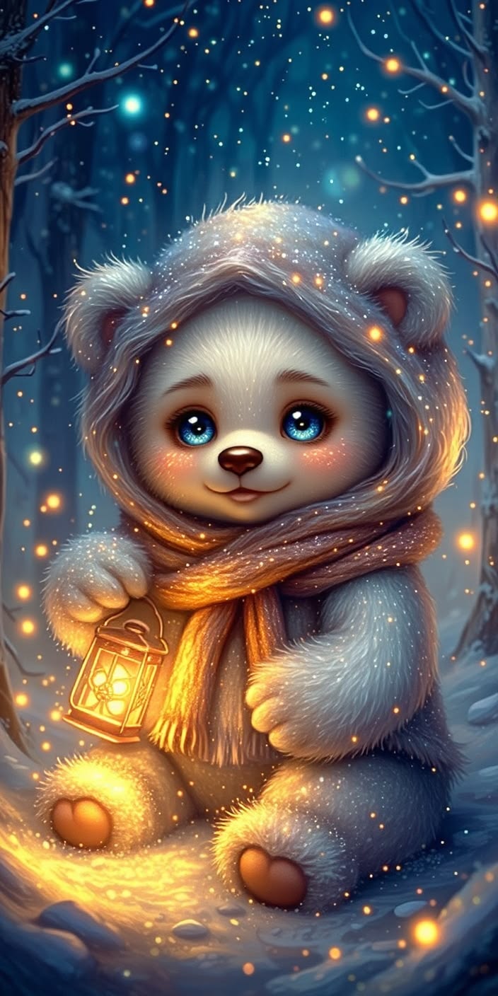 Cute white teddy bear holding glowing lantern in snowy forest, fairy lights, magical cozy winter atmosphere.