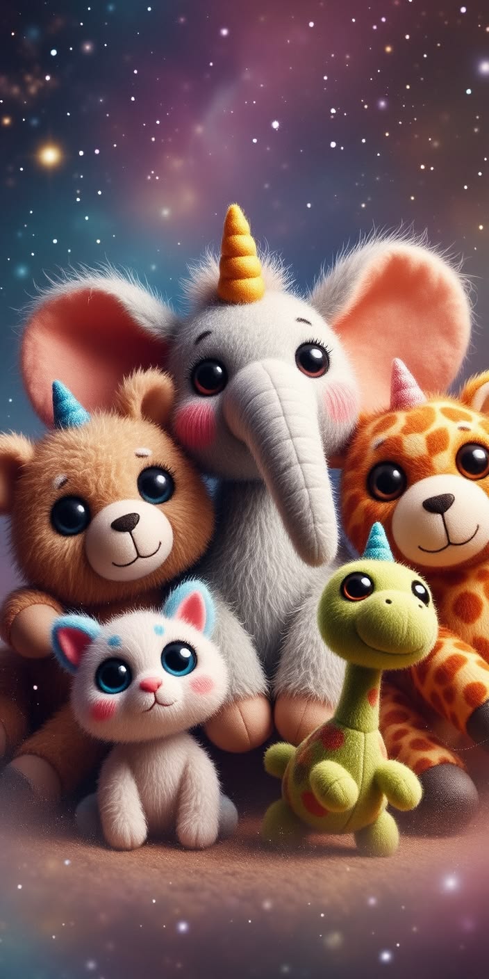 Five adorable plush animals in a dreamy starry galaxy create a playful, whimsical, heartwarming scene.