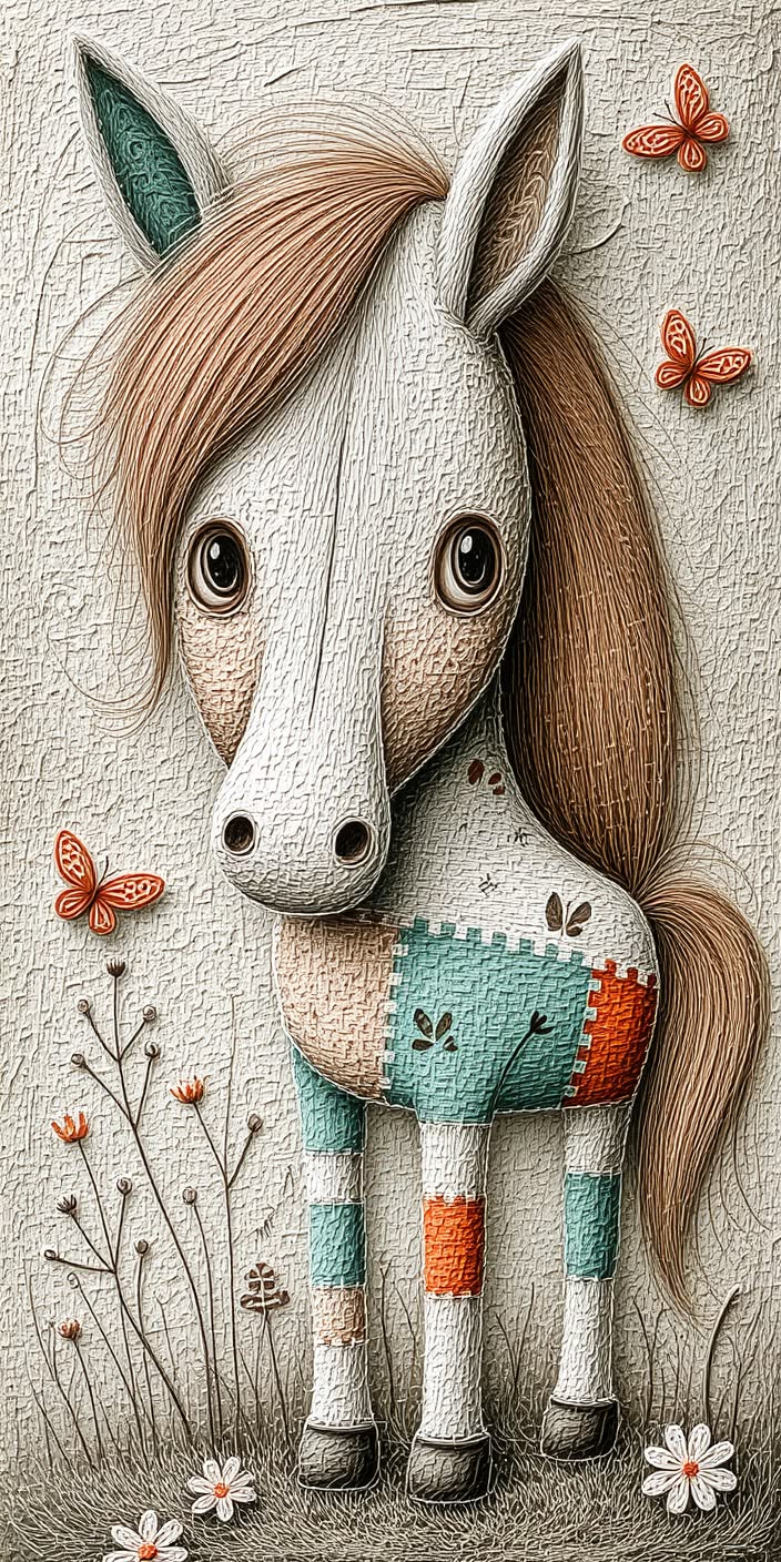 A charming digital illustration of a cute, cartoon-style pony with a soft, textured coat in gentle shades of white, beige, and light brown.