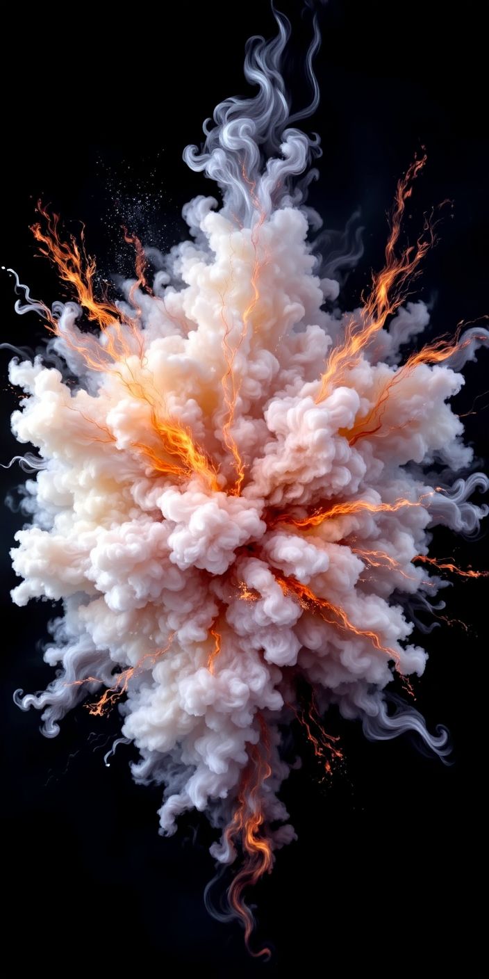 Intense explosion erupts with flames and thick smoke, dramatic contrast, chaotic energy, and powerful motion.