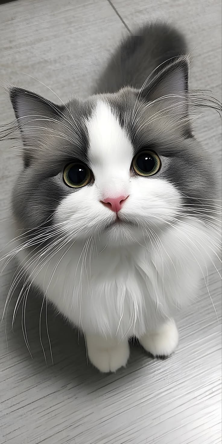 Fluffy grey and white Persian cat with green eyes sitting indoors, soft fur, calm curious expression.