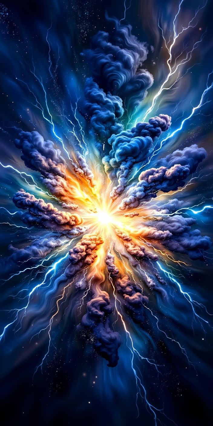 Radiant cosmic explosion with lightning streaks, swirling smoke, vibrant colors, power, motion and vast space.