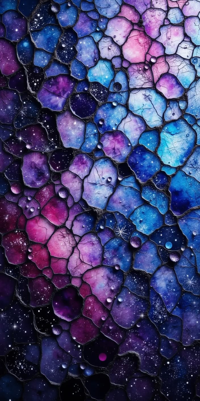 Vibrant stained glass mosaic with blue purple pink tones, glossy texture, sparkling light, cosmic flowing depth.