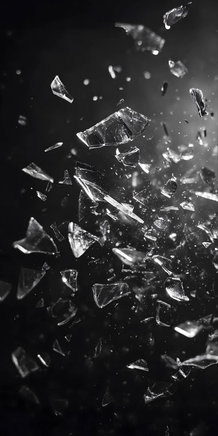 Black and white shattered glass fragments frozen midair, sharp reflections, dark background, dramatic motion, contrast.